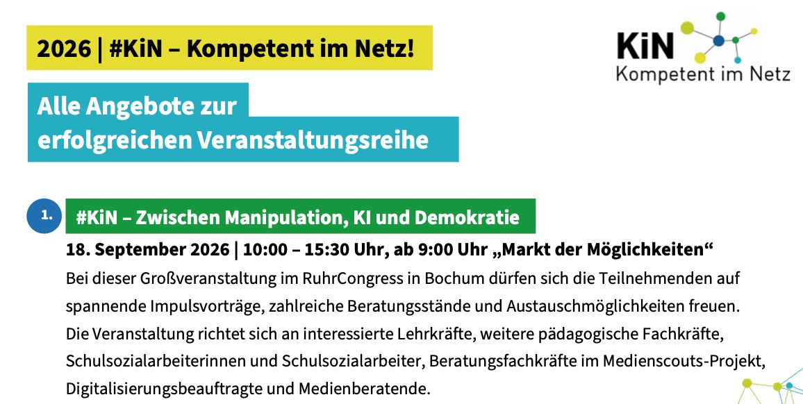 Save-the-Date: Das erfolgreiche Format „Kompetent im Netz (KiN)!“ des Landes NRW wird fortgesetzt: Auch in diesem Jahr wird es am 18. Sept. eine Großveranstaltung im Bochumer RuhrCongress zum Thema #KiN – Zwischen Manipulation, KI und Demokratie geben, sowie am 25. März ein Digital-Symposium zum Thema Medienwelt im Wandel. Außerdem gibt es zwischen Februar und Juli vielfältige Online-Veranstaltungen zum Thema. Alle Termine und Infos gibt es in folgendem Flyer (gern herunterladen und verteilen):